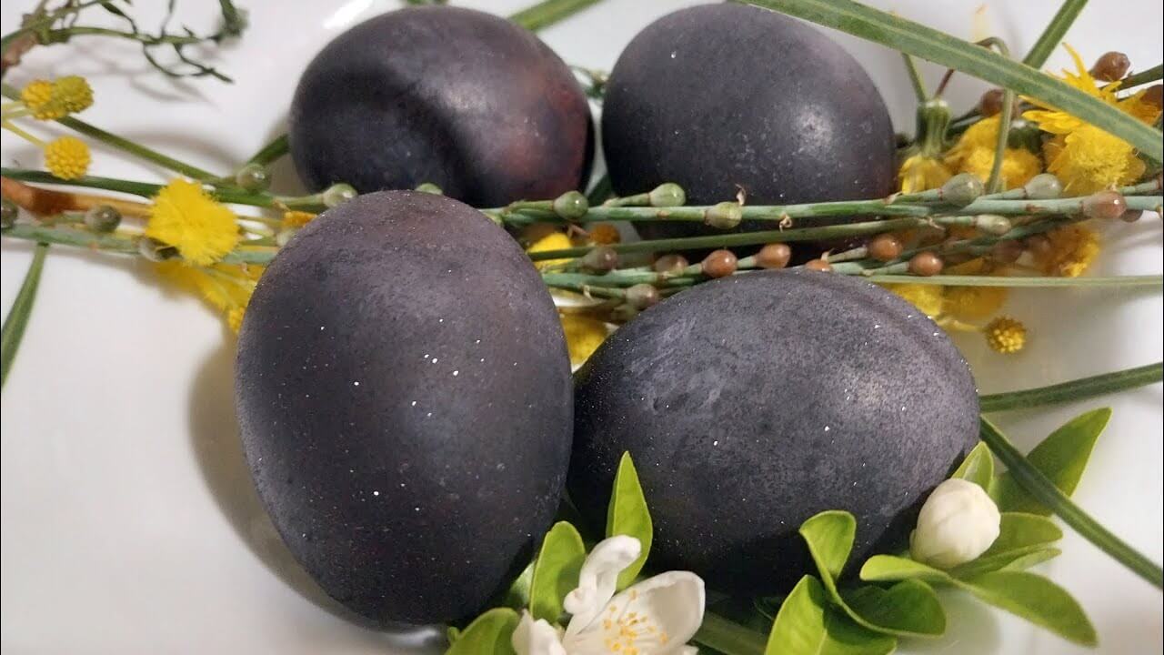 Margučių dažymas vynu – žėrintis juodas margutis laikomas rankoje