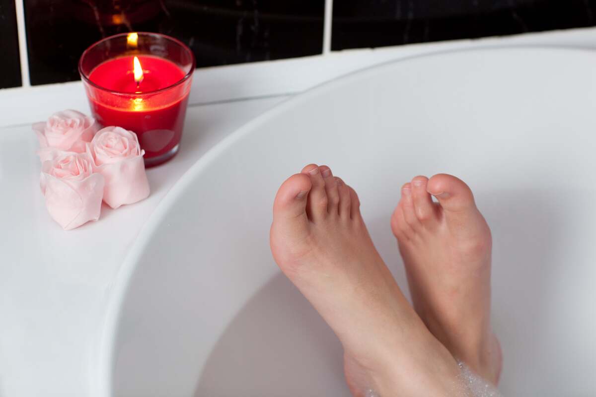 - Pėdas mirkykite apie 15–20 minučių, tada švelniai nusausinkite rankšluosčiu.