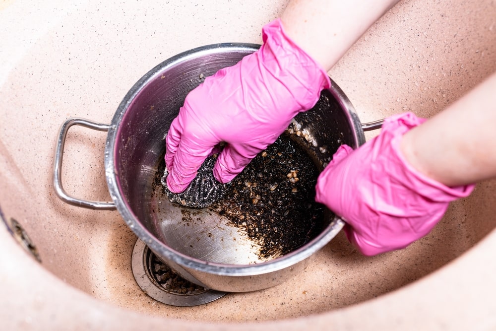 Pirmiausia ant puodo dugno pabarstykite kelis šaukštus kepimo sodos. Tuomet užpilkite karštu vandeniu tiek, kad padengtų užterštą vietą. Jei pridegimas didelis, verta palikti nakčiai – sodos tirpalas per tą laiką ištirpdys kietas nuosėdas. Vėliau užtenka lengvai perbraukti kempine, ir puodas atgauna blizgesį.