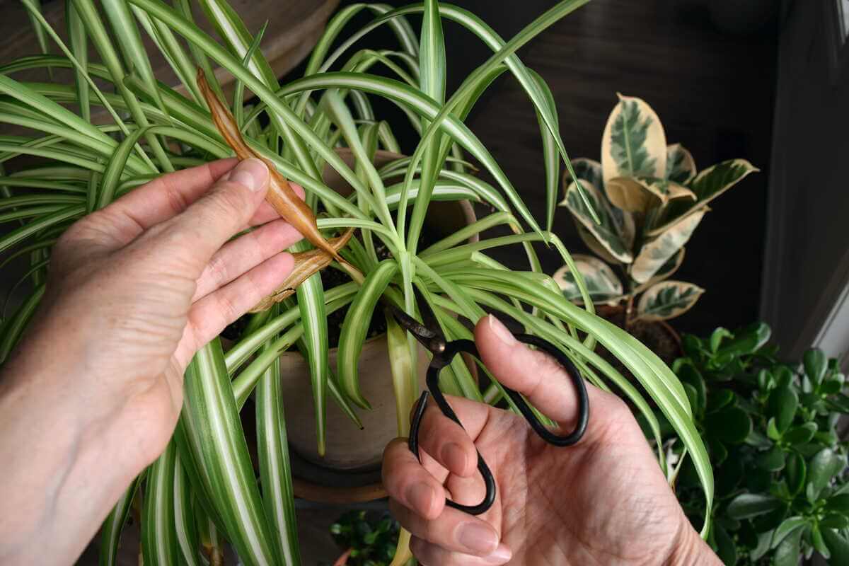 Parudavę lapų galiukai neatsigauna. Tai normalu. Juos galima atsargiai patrumpinti žirklėmis, paliekant natūralią lapo formą. Svarbu nepjauti per daug, kad nepažeistum gyvo audinio.