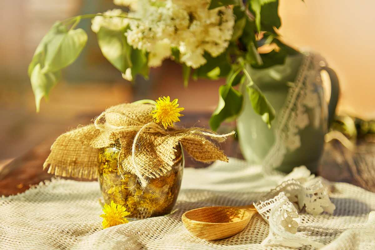 Aliejus nuo sąnarių skausmo – namuose pagamintas kiaulpienių aliejus stiklainyje su mediniu šaukštu.